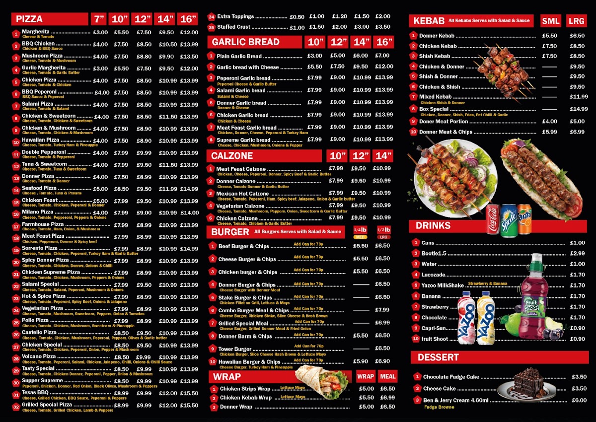 2 x 14 pizzas off your choice regular portions of donner meat large fries large bottle off drink